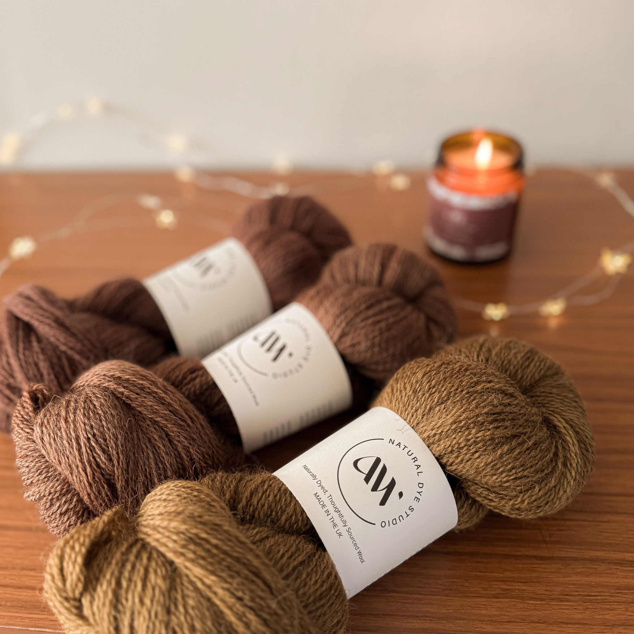 Each skein has been naturally dyed in my Gloucestershire studio using madder, walnut, henna, and goldenrod, creating warm, spiced colours.
